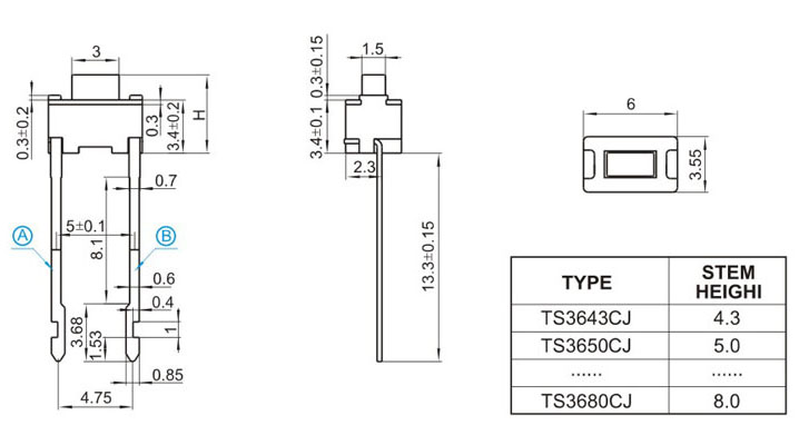 |  | | 型號規(guī)格:TS36HCJ系列 | 中文命名:3*6長二腳輕觸 |