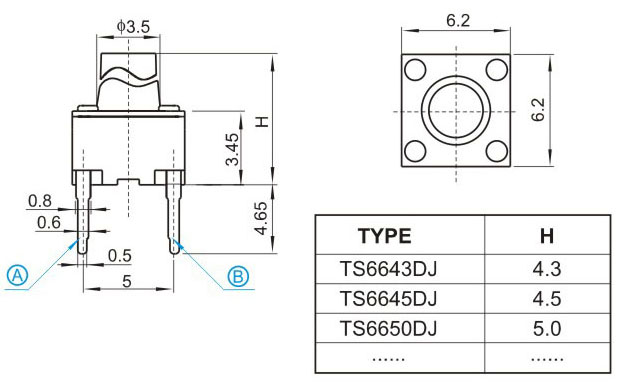 |  | | 型號規(guī)格:TS66HDJ系列 | 中文命名:6*6短二腳輕觸 |