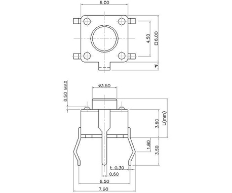 |  | | 型號規(guī)格:TS66HL系列 | 中文命名:6X6有腳蓋防水型輕觸開關(guān) |