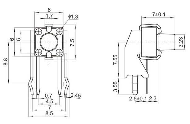|  | | 型號規(guī)格:TSZJ66HX系列 | 中文命名:6*6下支架輕觸開關(guān) |