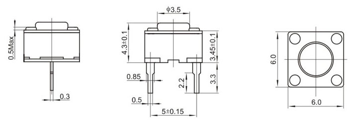 |  | | 型號(hào)規(guī)格:TS66HDJ-3系列 | 中文命名:6*6短兩腳輕觸(腳長3.3) |
