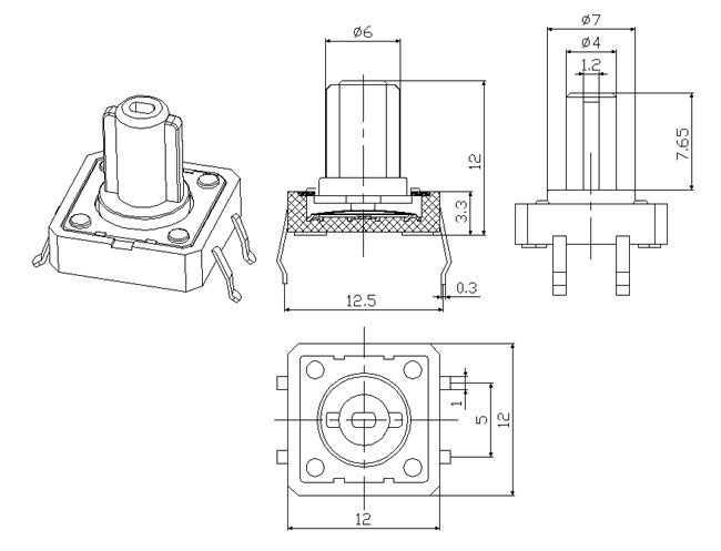 |  | | 型號規(guī)格:TSJ1212系列 | 中文命名:12*12飛機頭插腳型輕觸 |