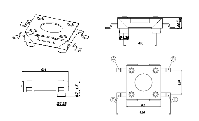 |  | | 型號規(guī)格:TSTP015系列 | 中文命名:1.5超薄定位平座輕觸開關 |