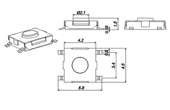 |  | | 型號規(guī)格:TSTP4515系列 | 中文命名:4.5x4.5x1.5貼片型輕觸開關 |